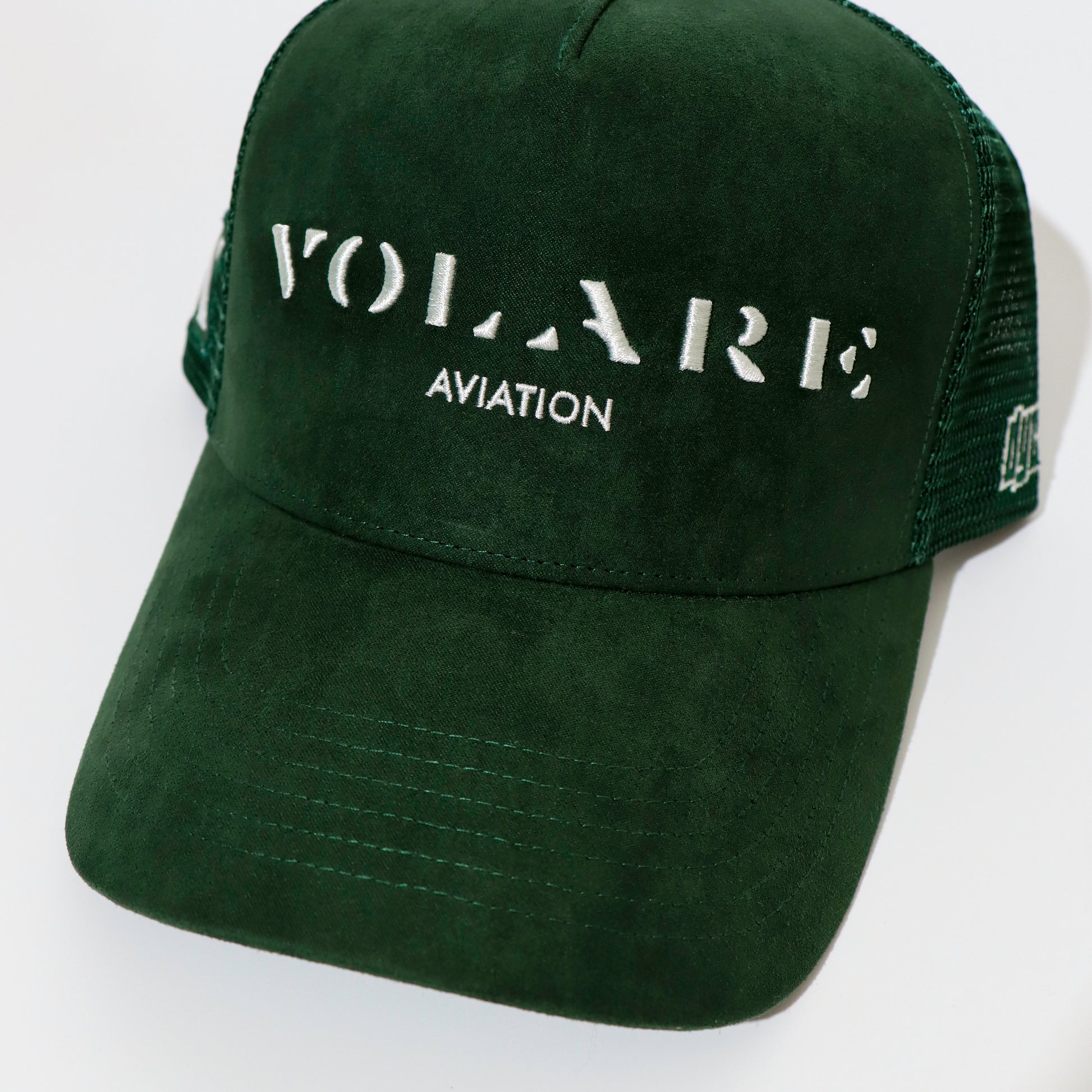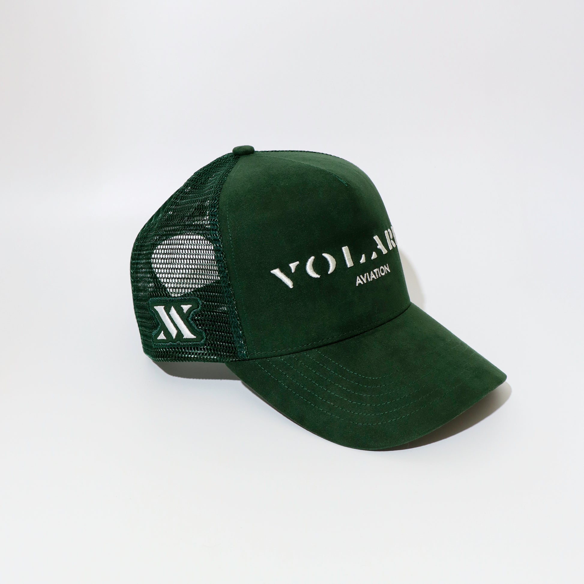 Volare green suede and premium hard wearing mesh shallow trucker cap.